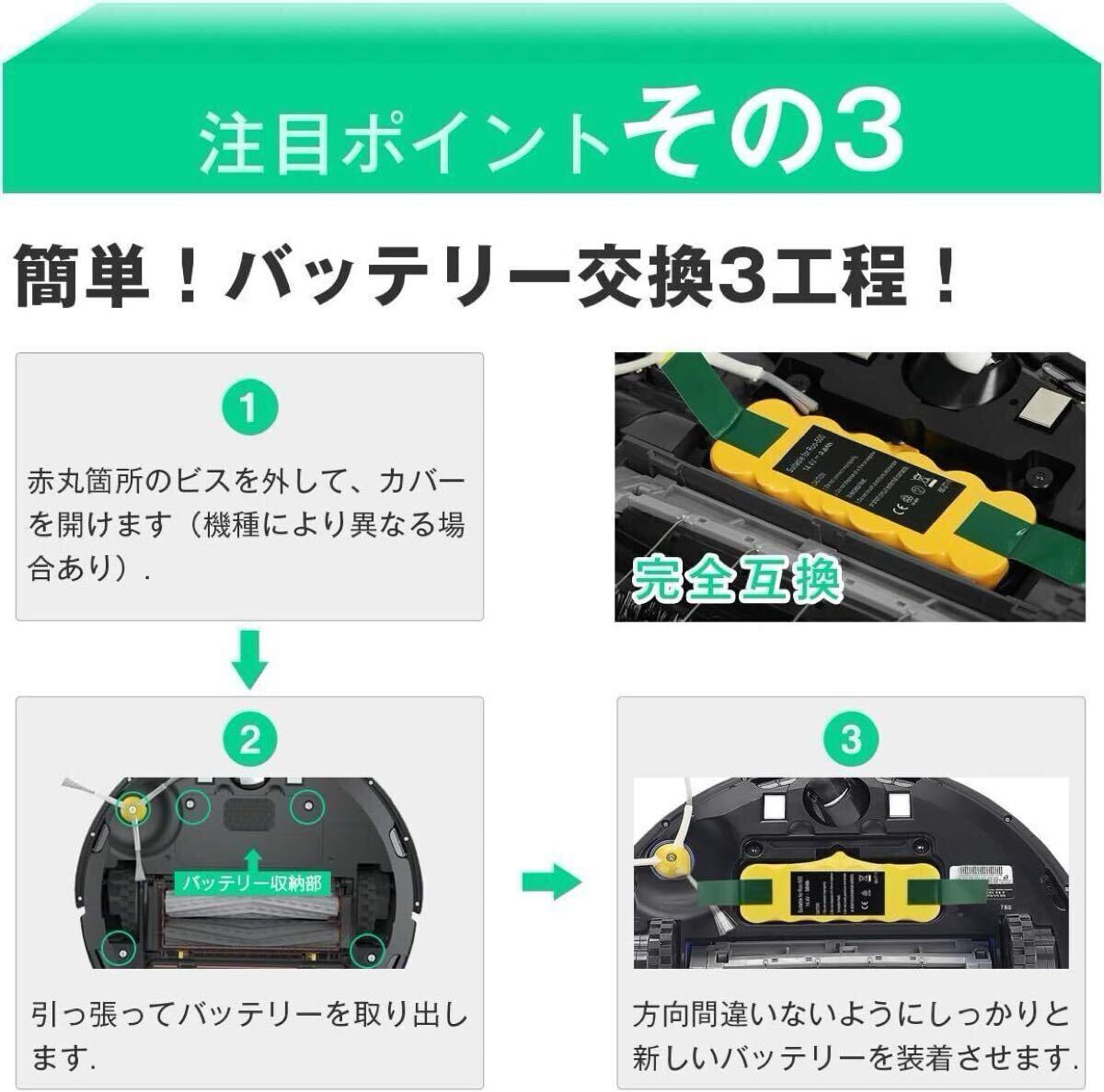 - 【商品仕様】:ルンバ 14.4vバッテリー ルンババッテリー14.4v ルンバ 互換バッテリー14.4v 3.8Ah 電池タイプ: Ni-MH 電池電圧: 14.4V 掃除機ルンバのニッケル水素互換バッテリーです 大容量4500mAhのため純正品より稼働時間が約1.5倍程度伸びます。電池サプライヤーとして、当店で提供している製品はすべてメーカーの元包装で、中間業者が差額を稼いでおらず、価格で絶対的な優位を占めており、できるだけお客様のためにより満足な購入機会を目指しています。ご安心購入してください。
